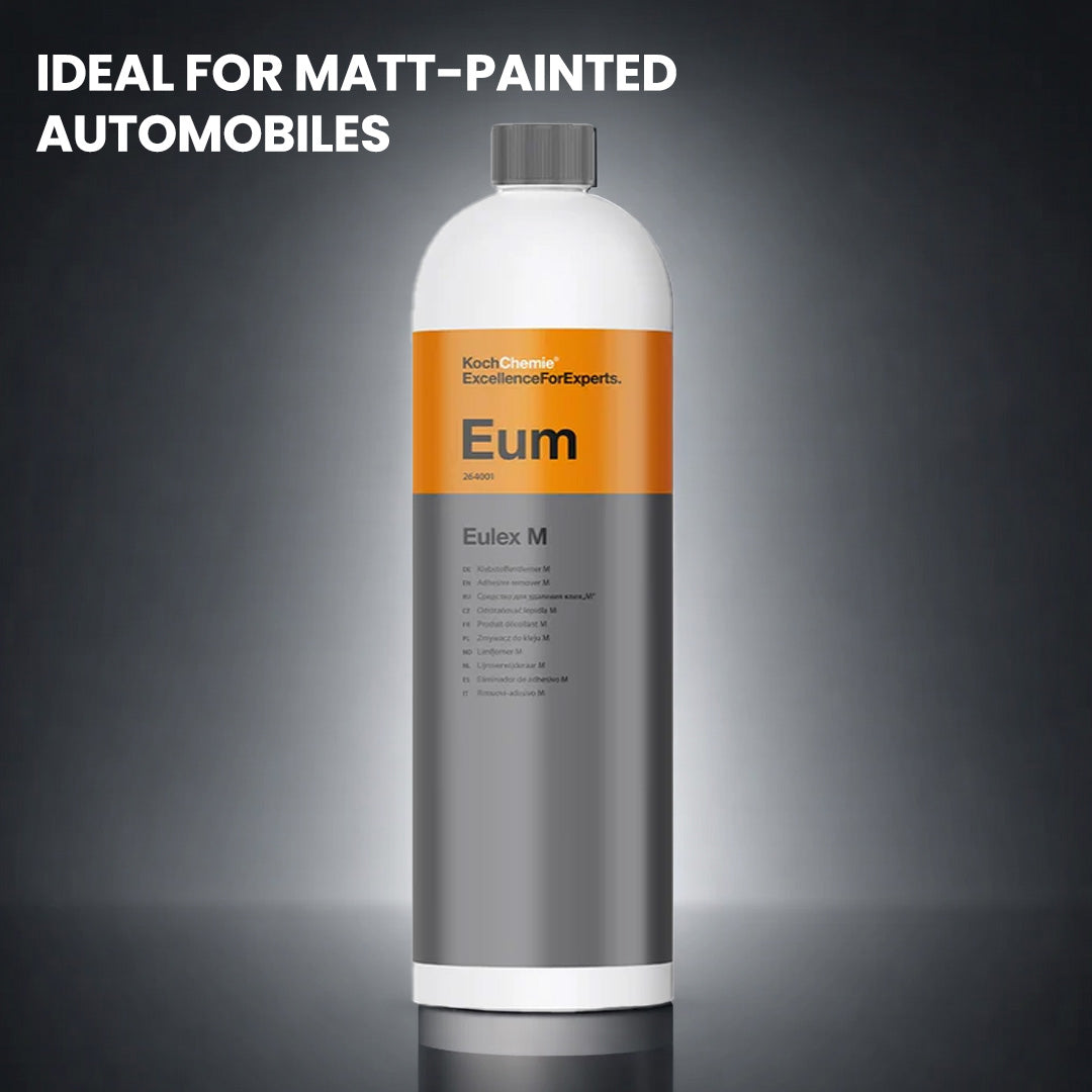 Introducing KochChemie Eulex M 1 Litre (Adhesive/Gum/Rubber Remover), your go-to solution for easily removing adhesive, tree sap, and rubber markings from a variety of surfaces. This low-odor special product is ideal for matt-painted automobiles, glass surfaces, and more. Organic residues are softened and easily removed thanks to its quick-penetrating composition. Furthermore, the active components are non-flammable, ensuring safety while use. Daimler-approved and built in Germany, the KochChemie Eulex M delivers outstanding cleaning performance.