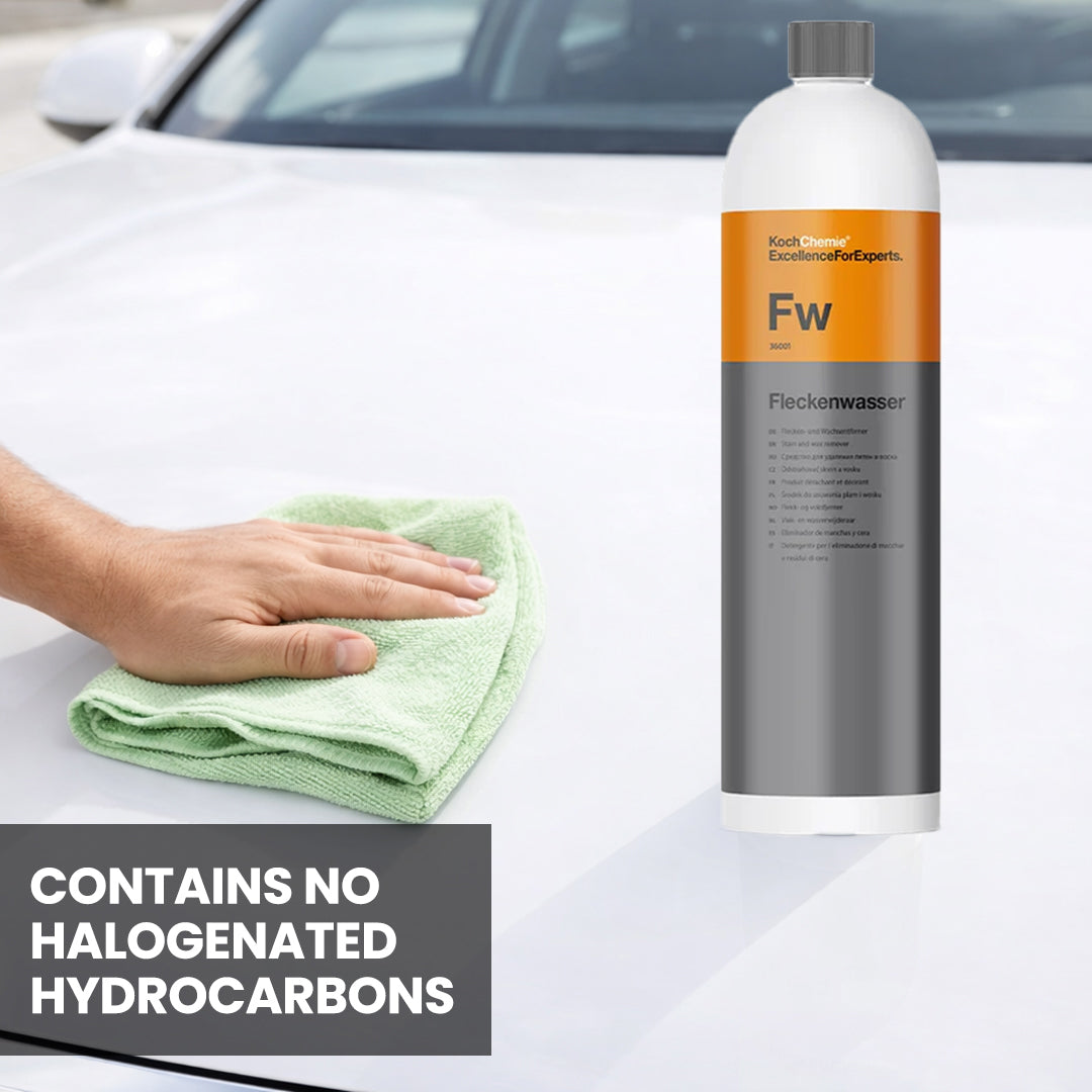 Introducing Koch Chemie Fleckenwasser 1Ltr, the ideal degreaser for removing tough stains and residues from various surfaces. This solution, made with powerful organic solvents, effectively dissolves greasy and organic residues such as cosmetics, oil, ink, paint, and more. Here's why it's an essential cleaning tool: